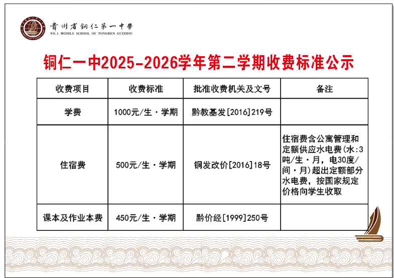 铜仁一中2025-2026学年第二学期收费标准公示